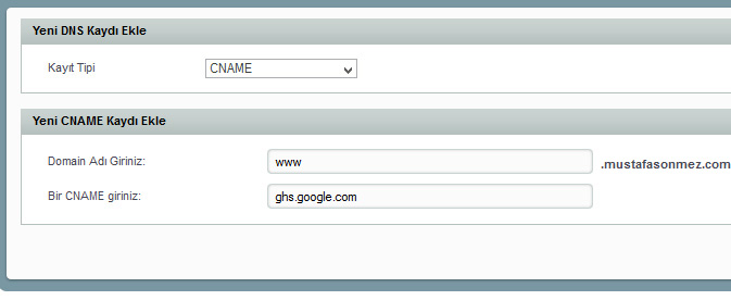 5) Yeni açılan özellikler menüsünde; "Domain Adı Giriniz" kısmına sadece www yazın. "Bir CNAME Giriniz" kısmına ise, ghs.google.com yazın ve "Devam"a tıklayın.