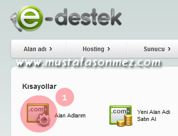 1) İlk olarak www.e-destek.com adresinden IHS yönetim paneline giriş yapıp "Alan Adlarım" butonuna tıklayın.